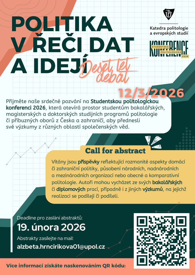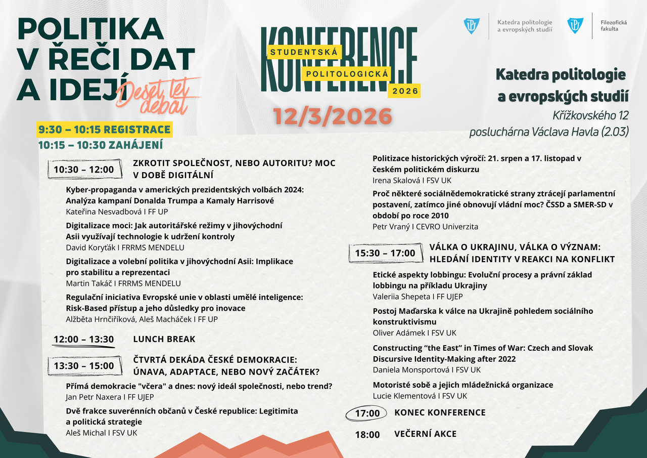 Letošní jubilejní desátý ročník konference se uskuteční ve čtvrtek 12. března 2026 v posluchárně Václava Havla na Katedře politologie a evropských studií, Křížkovského 12.